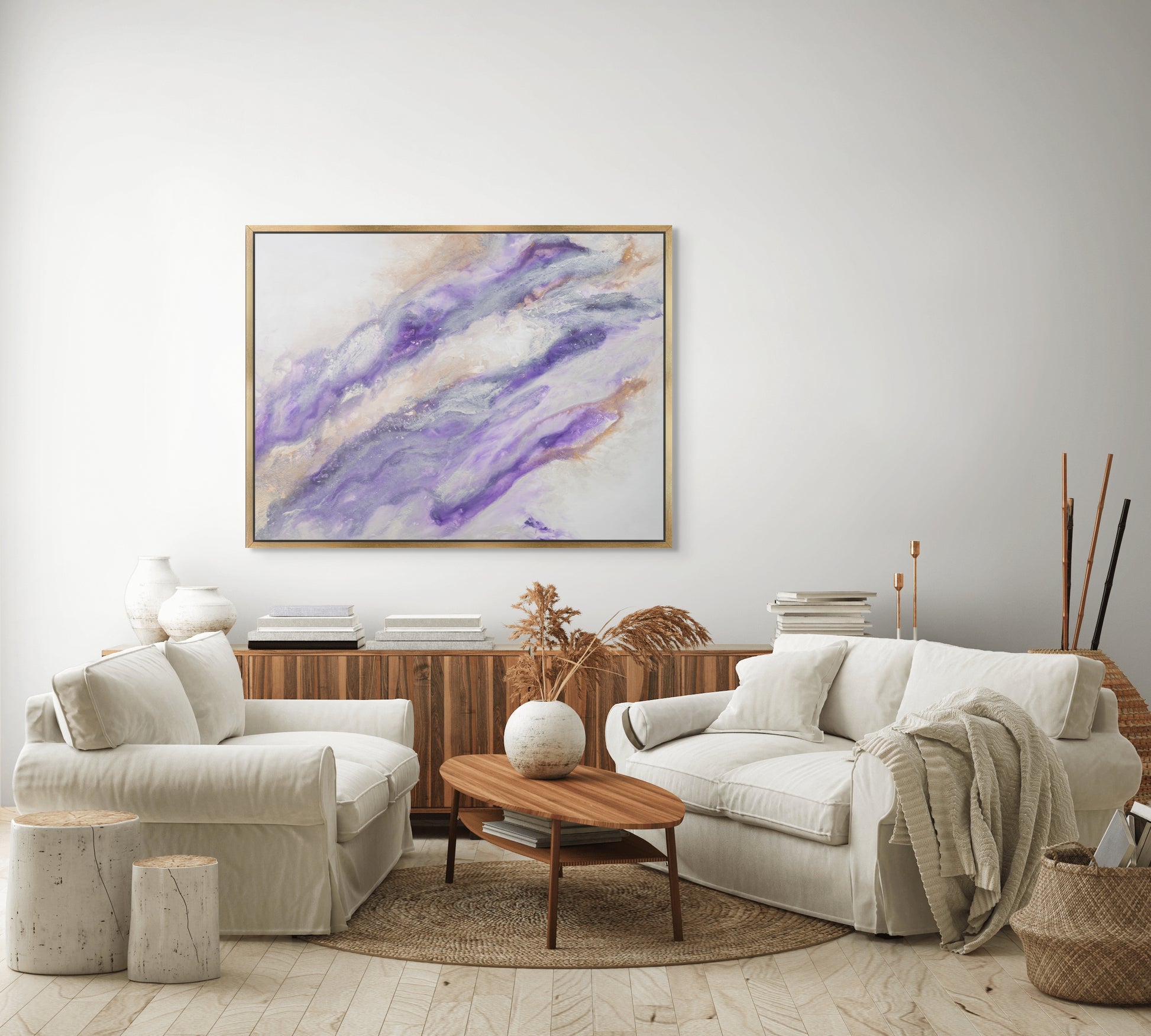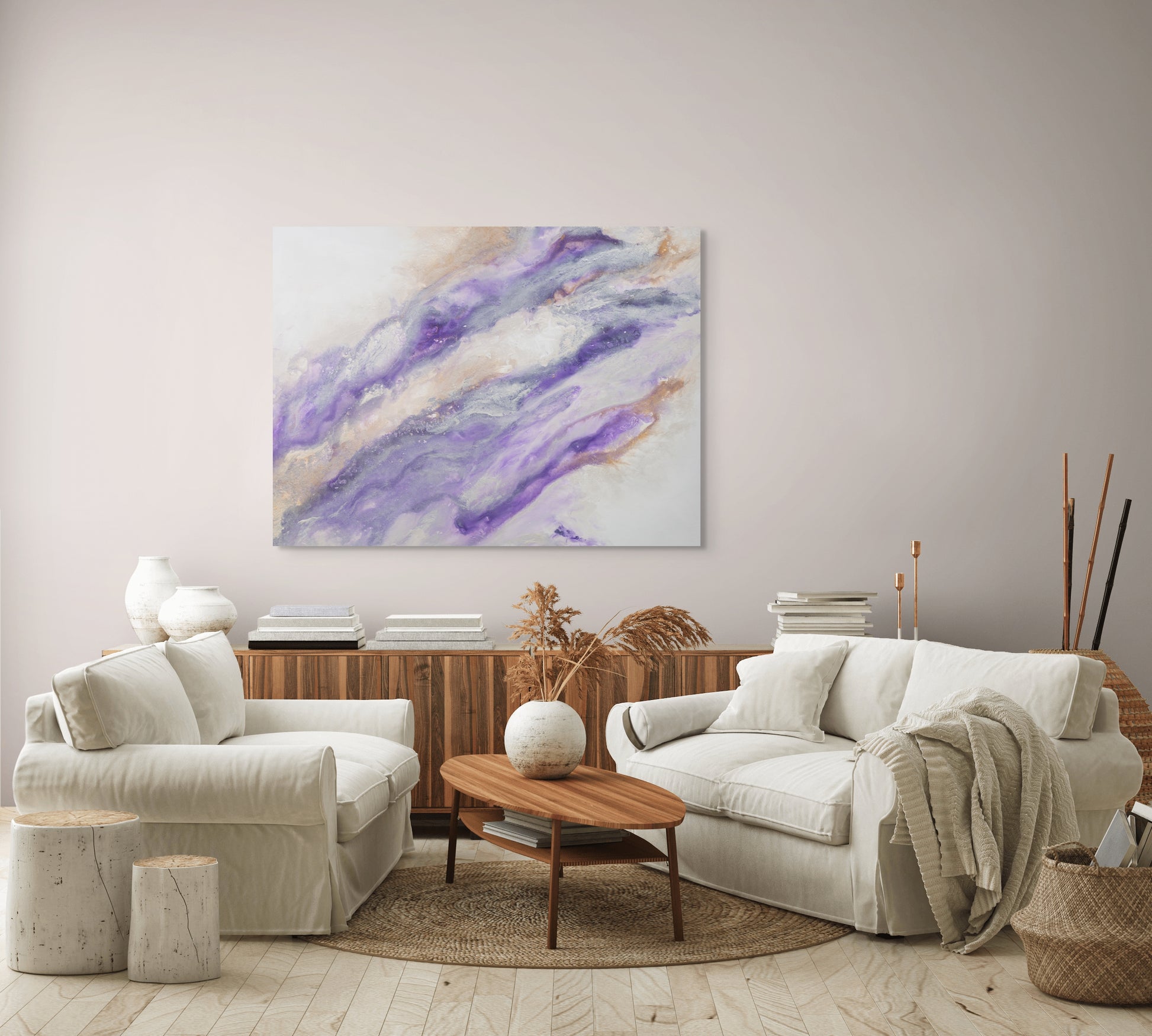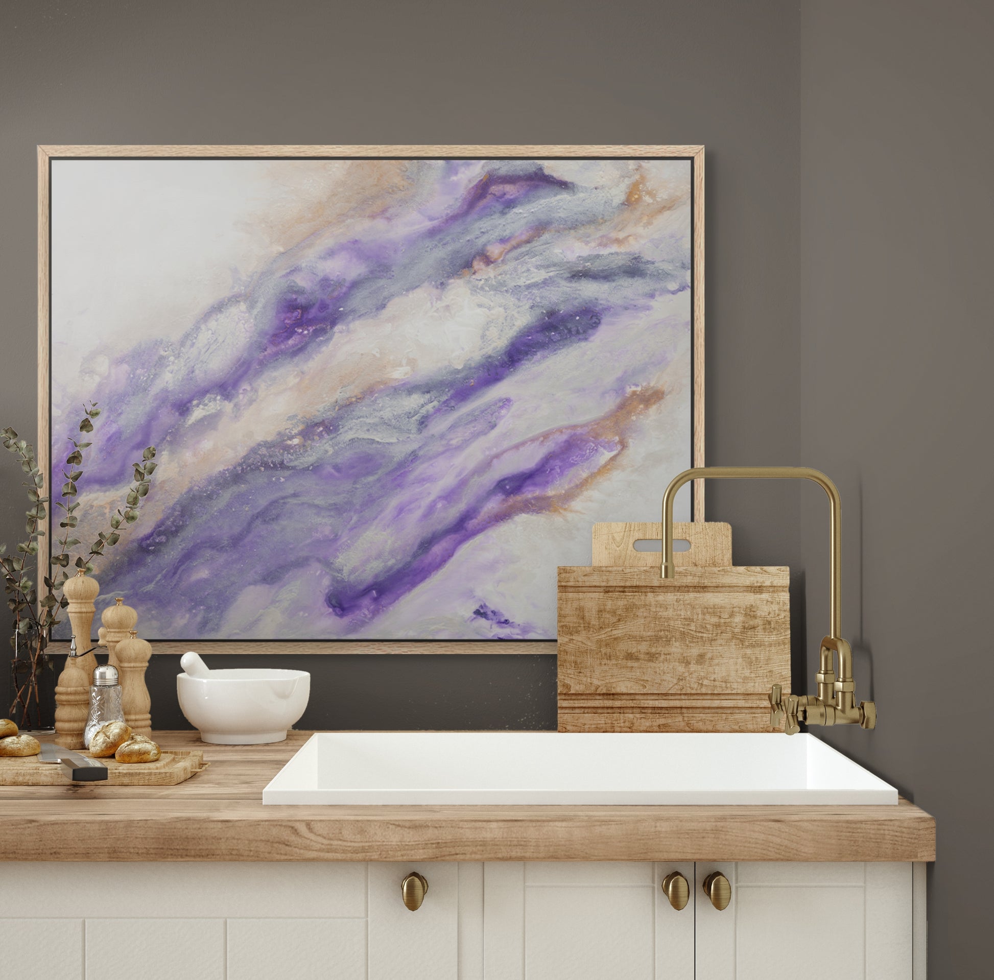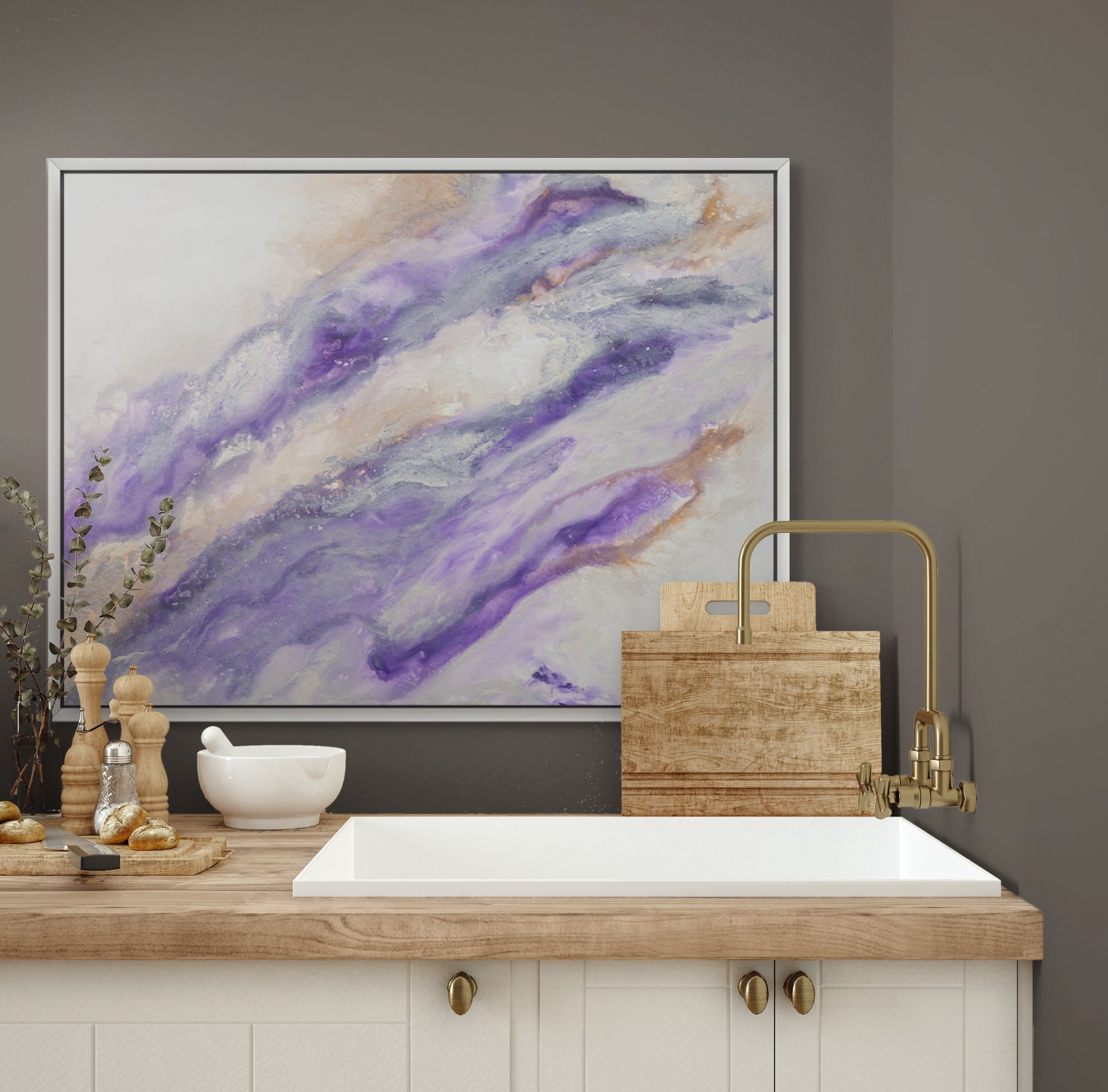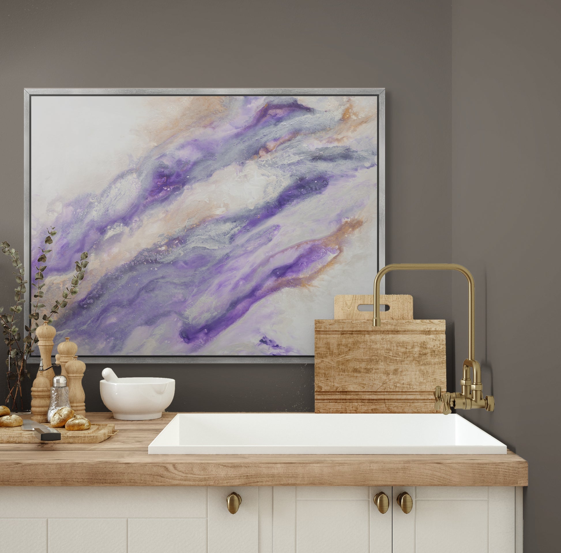 Bring powerful energy and modern elegance to your space with this one-of-a-kind abstract painting. Featuring bold shades of deep purple softly blended with white, this dynamic piece is accented with metallic bronze and silver highlights that catch the light beautifully.