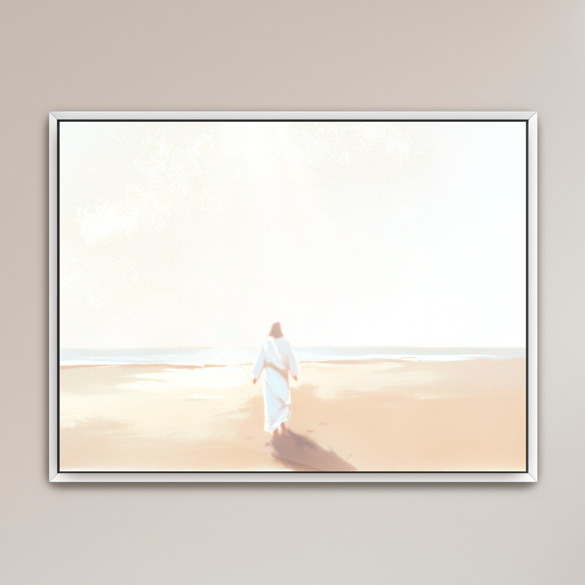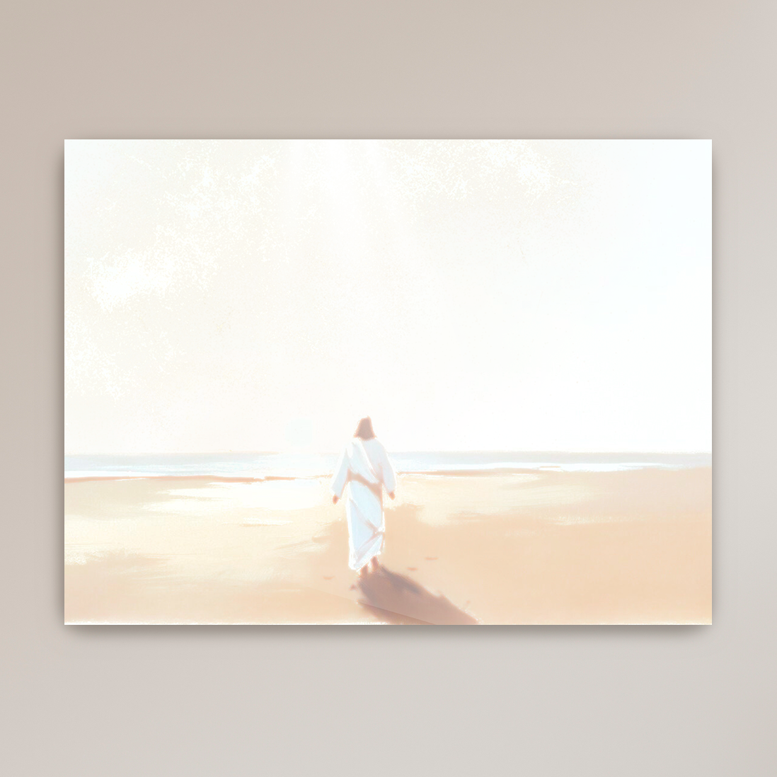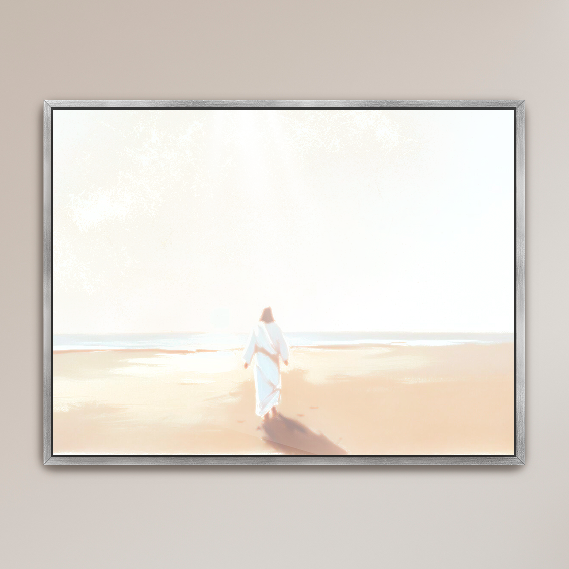 This piece features a serene depiction of Jesus walking along the shoreline, illuminated by a warm, heavenly glow. The scene captures the comforting truth that no matter how dim our path may feel, His light always goes before us.