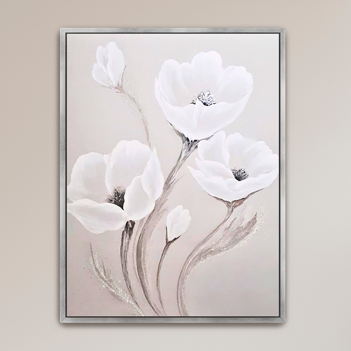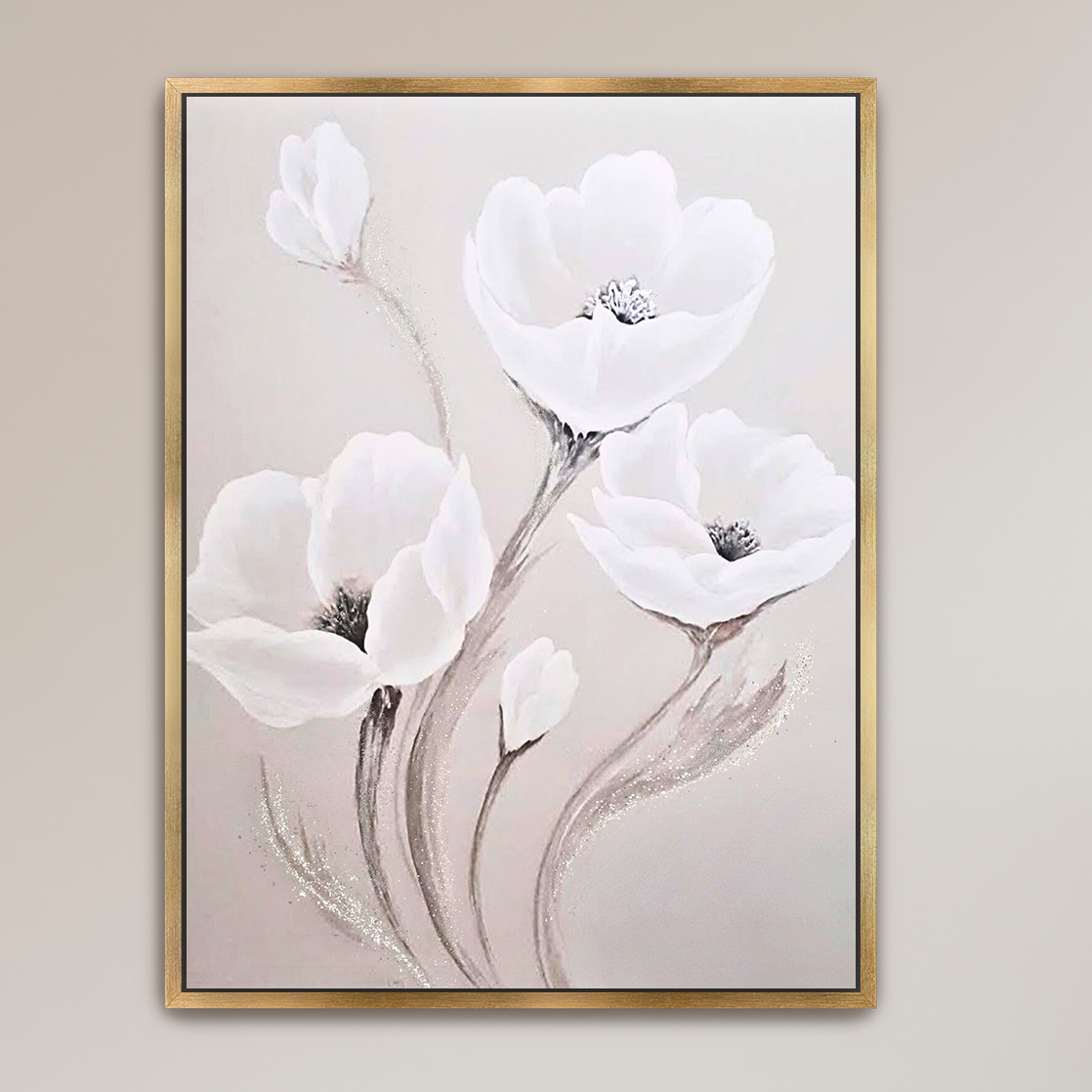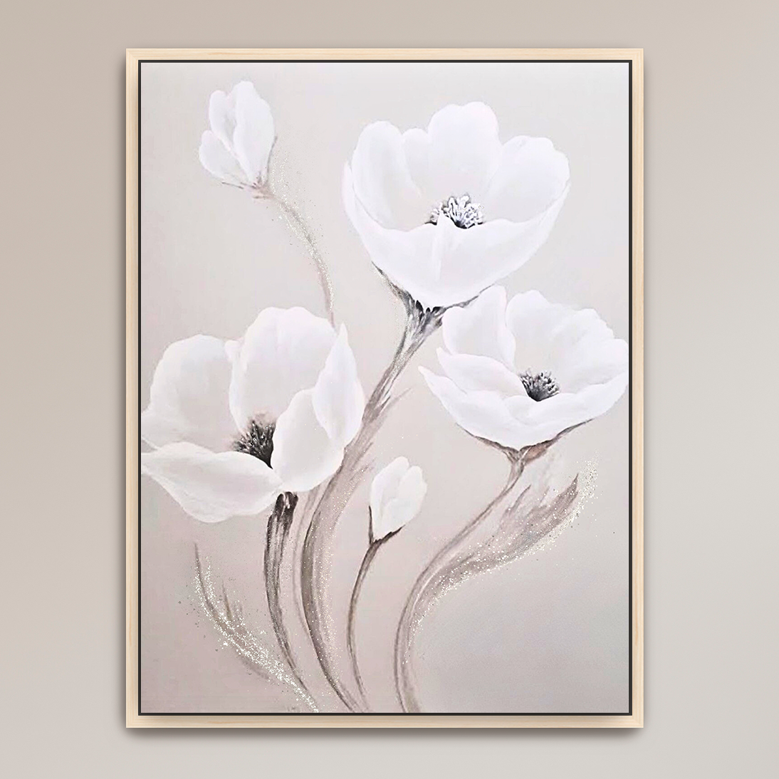 Delicate and serene, "Whispers of Grace" is a hand-painted piece that captures the quiet beauty of blooming white flowers against a soft neutral background.